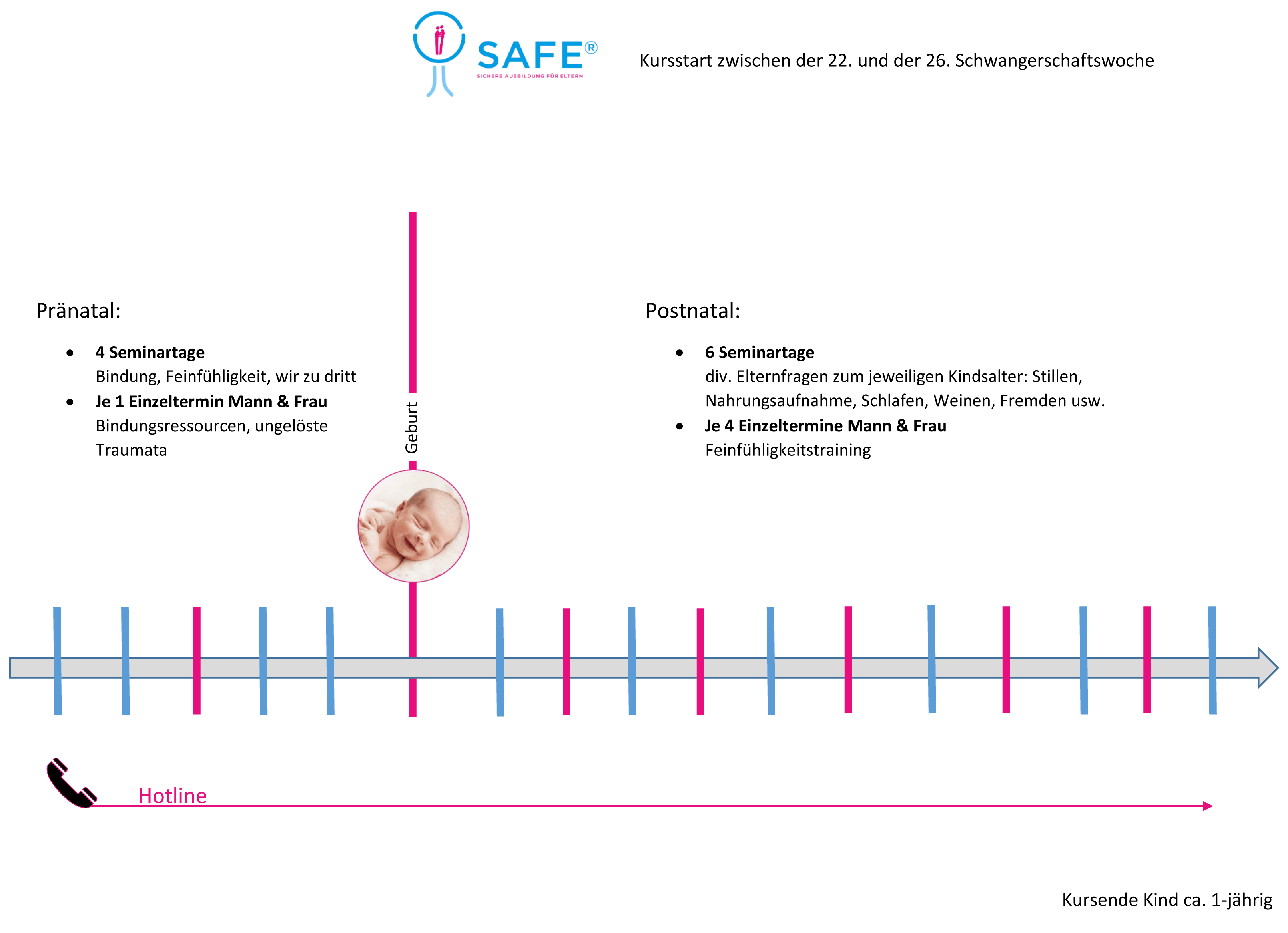 SAFE® startet ca in der 22. Schwangerschaftswoche und dauert bis zum Ende des Ersten Lebensjahres des Kindes. SAFE® bereitet Paare auf die Elternschaft vor und begleitet sie während den ersten 12 (wichtigsten) Lebensmonaten des Kindes.